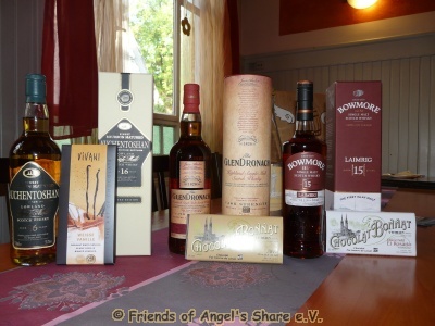 Das Abendprogramm Whisky und Schokolade war wie folgt besetzt: Zum Auchentoshan 16 Jahre Bourbon Wood gab es die Vivani Weiße Vanille Bioschokolade, zum Klasse Speysider Glendronach Cask Strength Batch 1 die Milchschokolade Bonnat Java und zum Bowmore 15 Jahre Laimrig Batch 3 schließlich die Bonnat Hacienda El Rosario aus Venezuela.