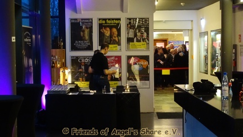 Der Whiskyprobenstand vor Ort in voller Pracht - so schmiegte er sich ein zwischen dem Eingang des Scala und dem Zugang zum Konzertsaal.